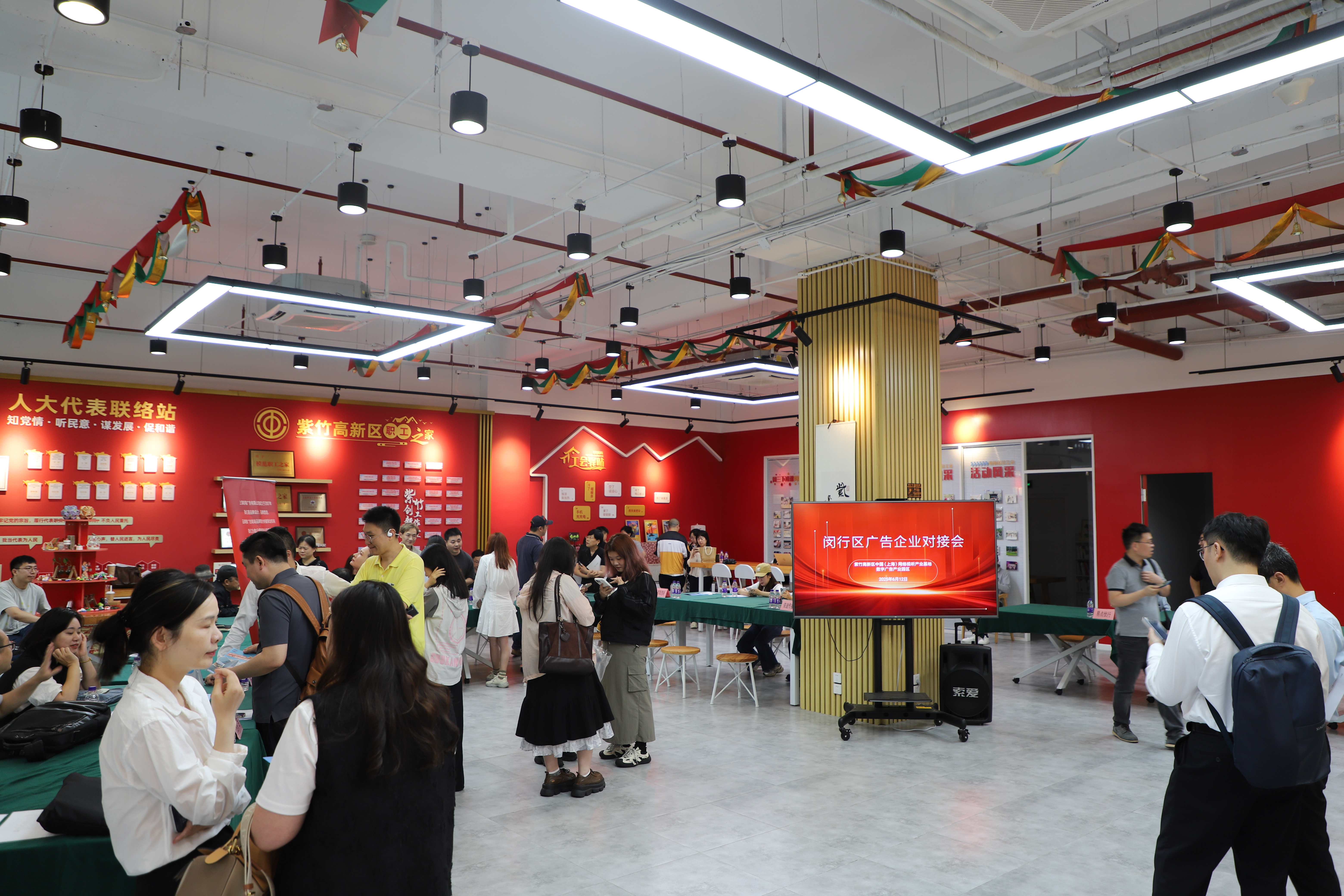 会议举办的同时,闵行区广告产业对接会也在位于视听产业基地下沉式广场的党群活动室举办,吸引了四十多家广告、电商、营销等为主营业务的企业参加,企业代表在活动上对接需求、沟通项目、讨论广告传统业态向数字化转型的趋势等,集齐了闵行区内广告产业各个链条上的典型企业与创新项目。