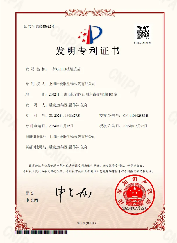 上海申锐联生物医药有限公司申请的“一种gnrh核酸疫苗”于近日获得国家发明专利授权。