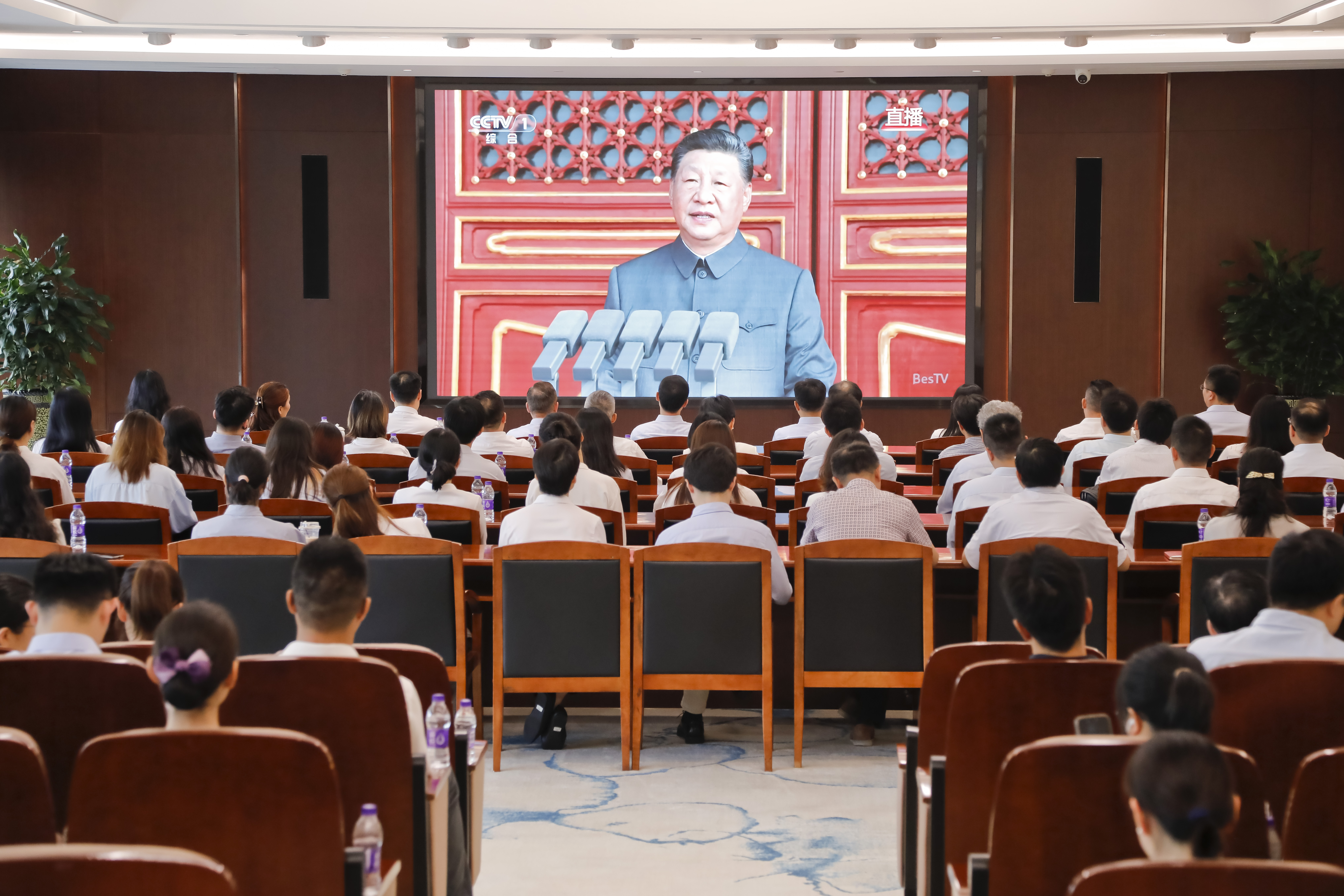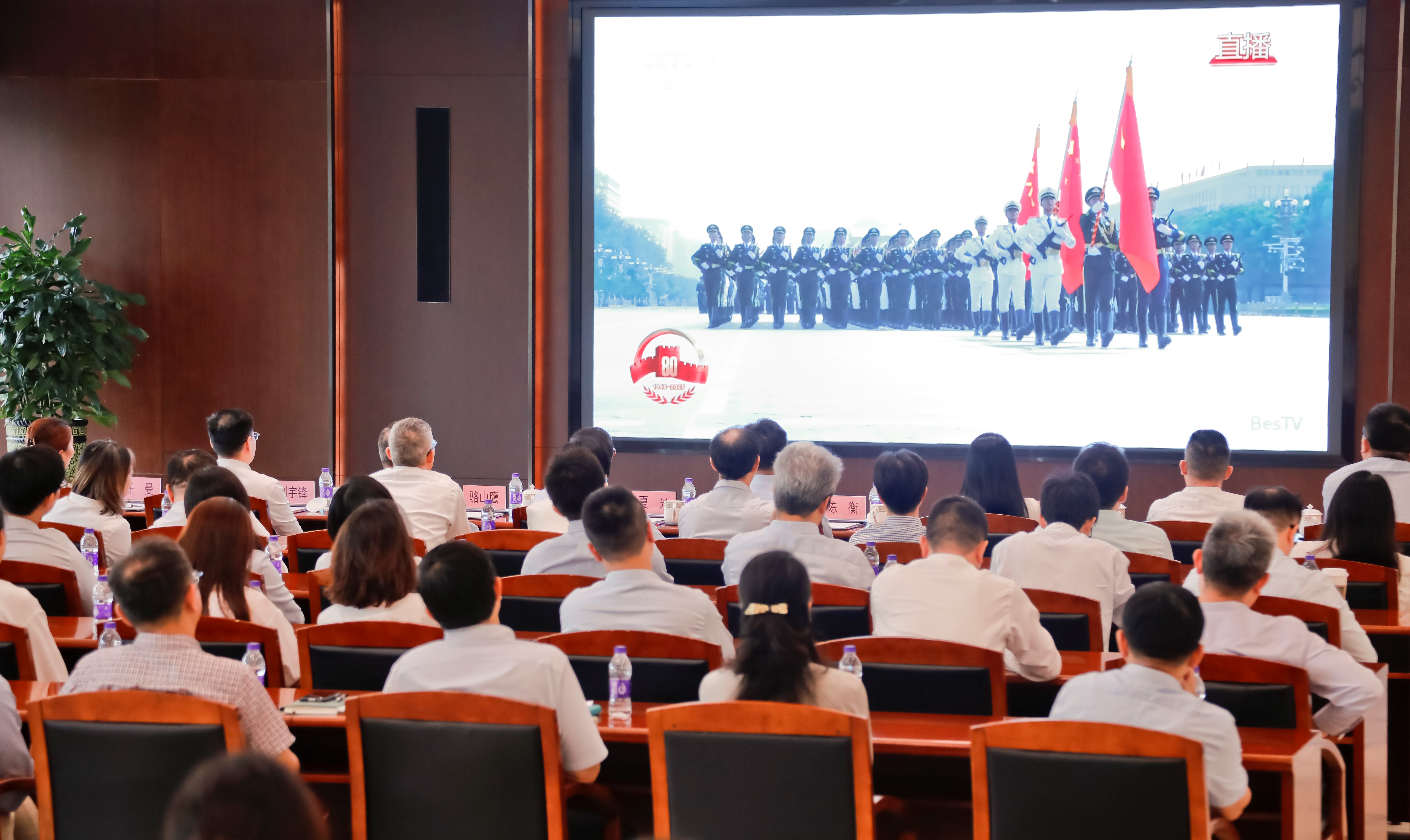 2025年9月3日上午,紫竹高新区集团公司第一党支部与第二党支部的党员干部以及集团公司本部全体员工130余人,齐聚高新区本部大楼二楼培训中心,共同观看纪念中国人民抗日战争暨世界反法西斯战争胜利80周年大会及阅兵仪式盛况直播。