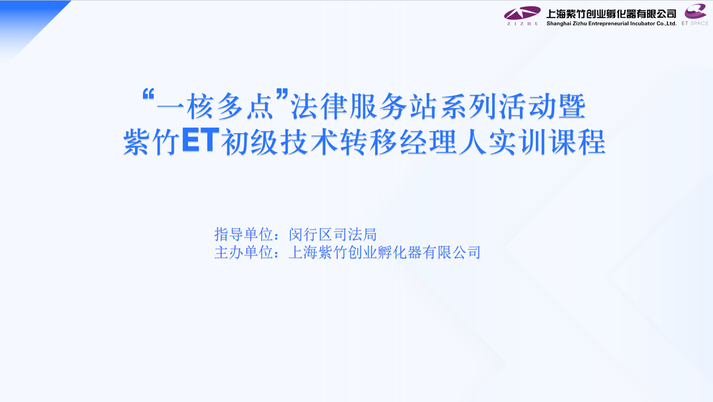 2025年9月19日上午,由闵行区司法局指导、紫竹创业孵化器公司主办的“一核多点”法律服务站系列活动暨紫竹et初级技术转移经理人实训课程(第二期),通过线上形式举行。紫竹创业孵化器总经理丁嘉敏、紫竹创业学院副院长童欧蓝作为特邀嘉宾出席,来自大零号湾的首批科创律师共同完成第二期“技术转移需求挖掘”模块学习。