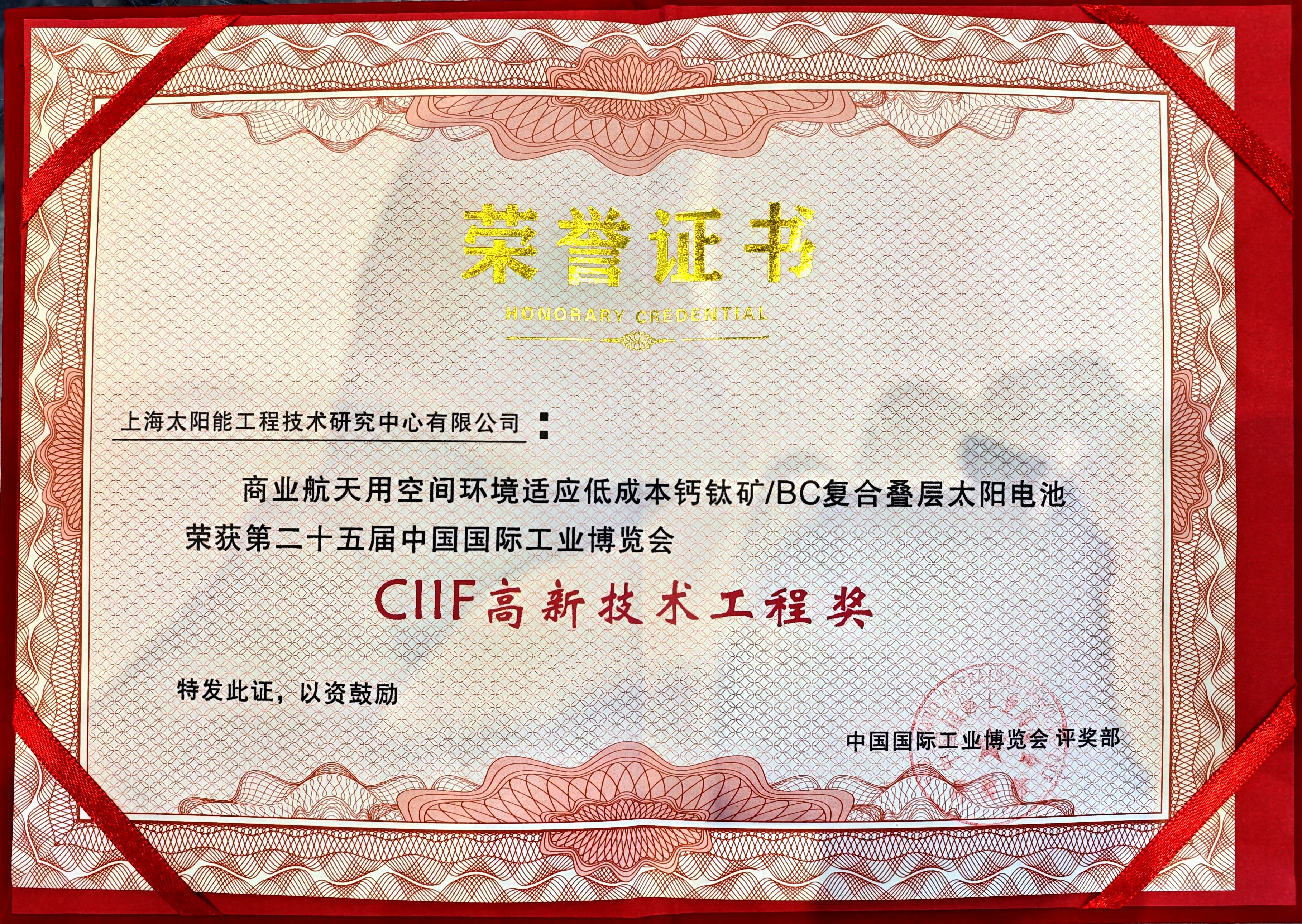 2025年9月23日,第二十五届中国国际工业博览会在上海国家会展中心隆重开幕。当日上午,在上海市国防科技工业协会主办的高新技术成果展开幕式上,颁发了该展区中获得工博会评奖奖项的证书与奖杯。上海太阳能工程技术研究中心有限公司申报的“商业航天用空间环境适应低成本钙钛矿/bc复合叠层太阳电池”展品,荣获“ciif高新技术工程奖”,公司副总经理赵昱枫代表公司登台领奖。
